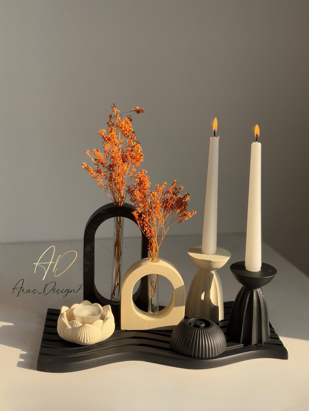 ست دکوری و تزیینی جلو مبلی سینی موج مشکی-کرم